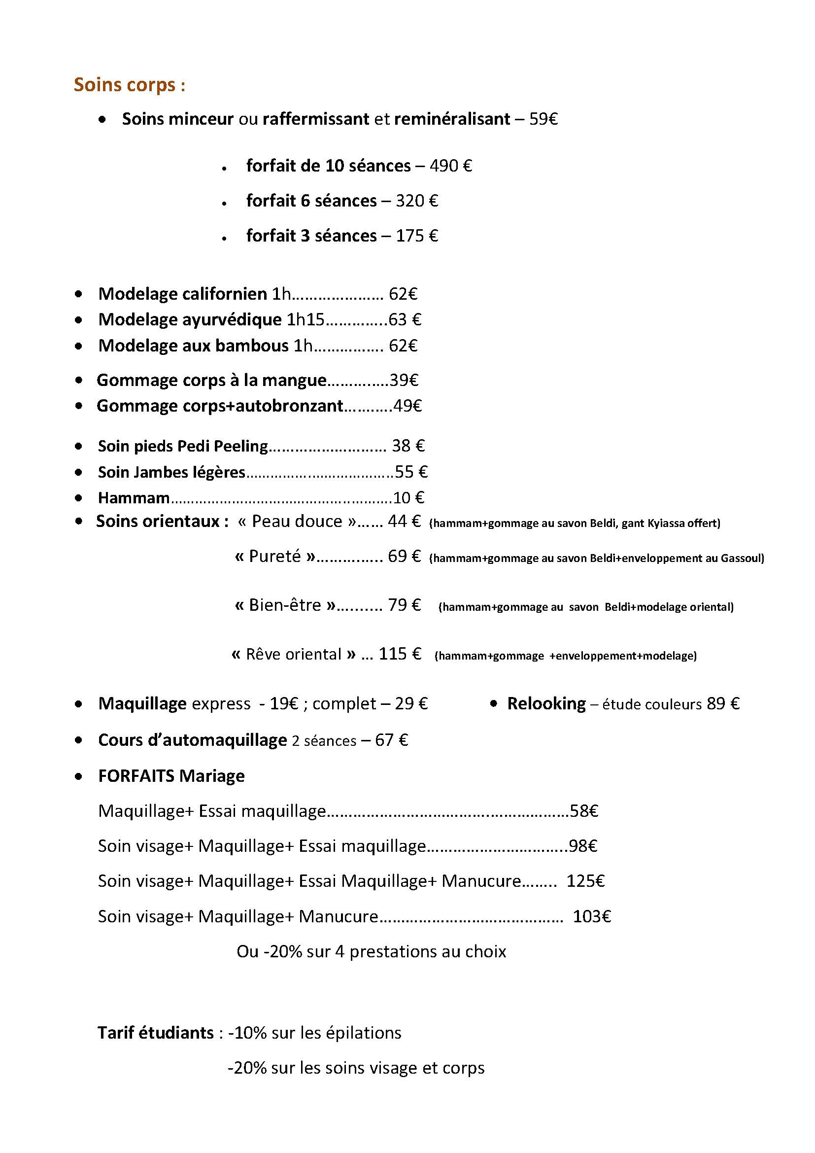 | Formule BEAUTE (60 mn) – Soin visage détente + Mise en beauté + 1 produit de soin | 105.00 |